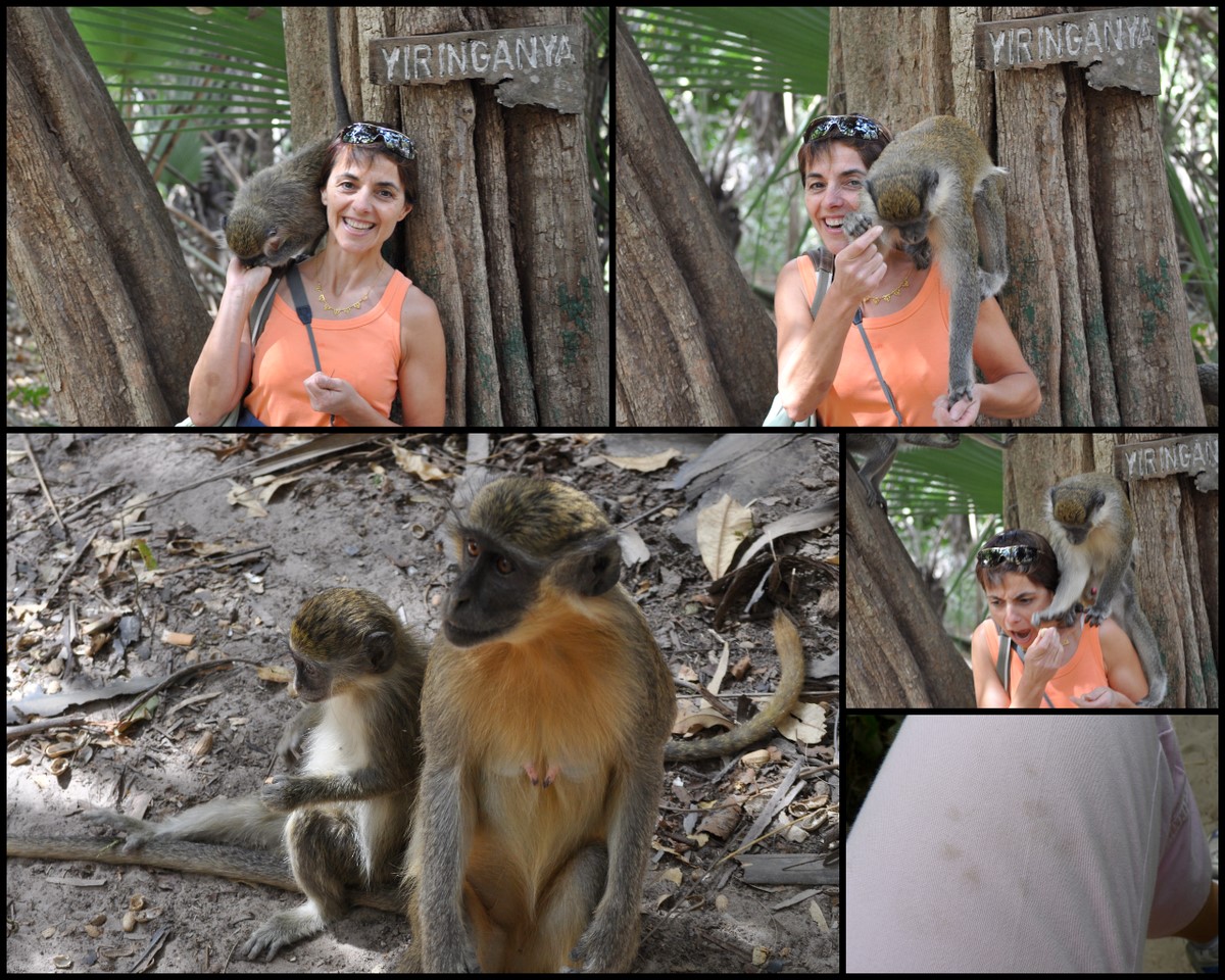 A moins d'un kilomètre de la forêt se trouve l'hôtel Kairaba et son directeur Gérard nous expliquait que tous les jours (surtout le matin) il voit les singes passer et même s'arreter pour ne pas dire s'installer dans son transat. Pour eux ils sont un peu une nuisance car ils mangent toutes les plantes tendres et fleurs sur leur passage; et s'il y a un potager, aucune chance d'y voir pousser autre chose que des plantes aromatiques (qu'ils n'aiment pas). Les hôtels informent aussi leurs clients de ne pas nourrir les singes pour les inciter à rester dans leur zone et qu'ils ne "s'installent" pas près des habitations.